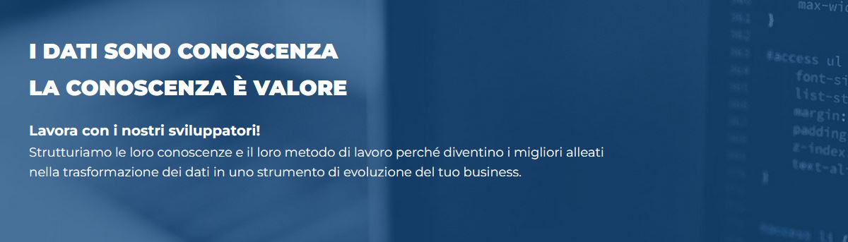 Aiutiamo le aziende nella loro trasformazione in un modello data driven offrendo know-how e professionalità di alto livello, utilizzando risorse e talenti in formazione continua per garantire un servizio di eccellenza ai nostri partner.